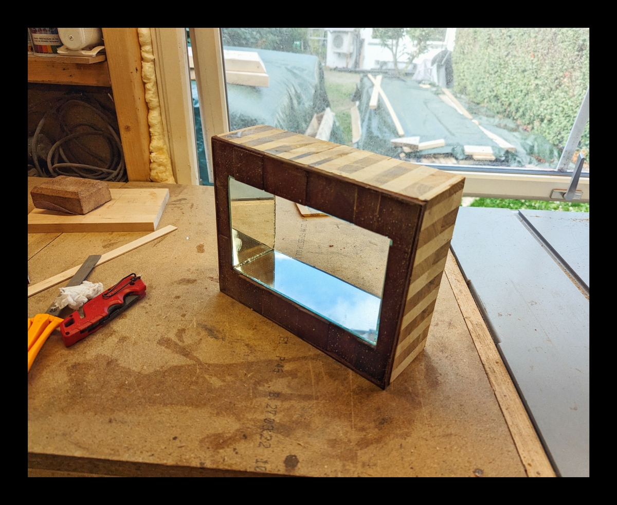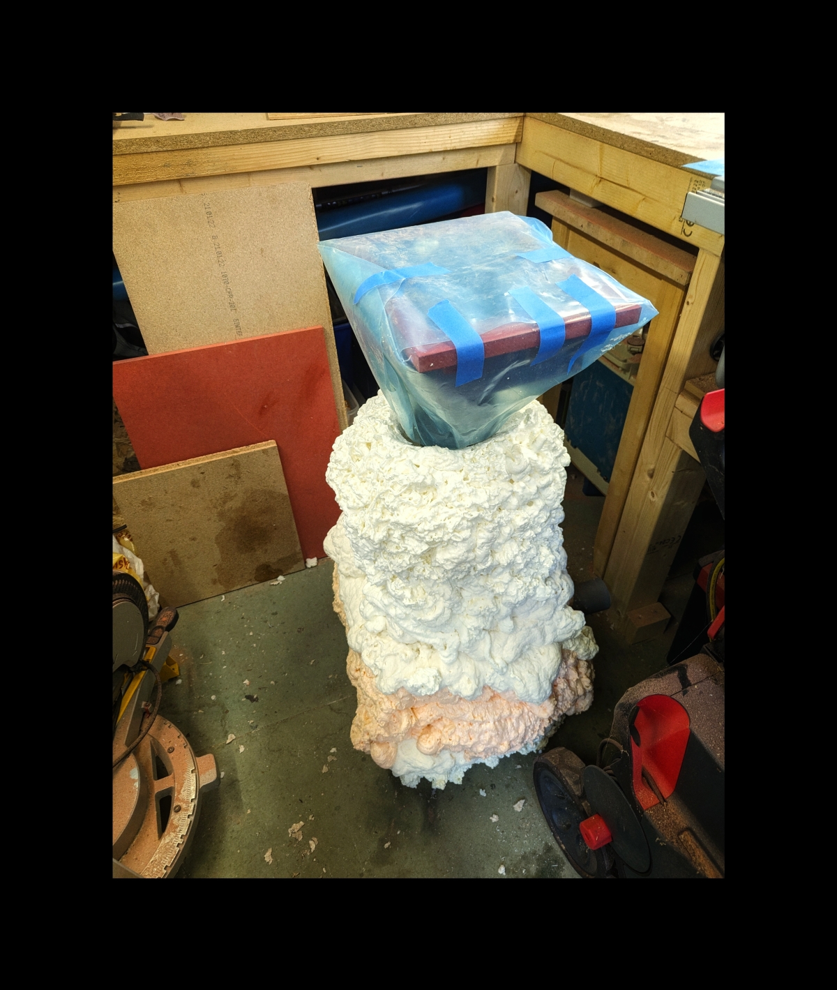 The physical installation took several attempts to perfect. Initially, I tried to create a retro-style TV box, but this idea was abandoned, simply because it did not become an interesting visual object. Instead, I opted for a more modern design using construction foam to create a base that would support the video display. The final installation is a mix of functionality and aesthetics, with a mirrored interior that reflects the video, creating an infinite loop of visuals.